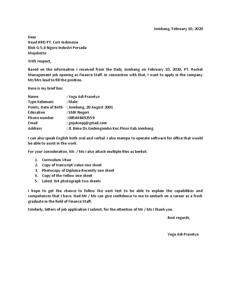 Ketika anda hendak membuat contoh cover letter bahasa indonesia maupun bahasa inggris, ada beberapa hal yang perlu anda perhatikan.artinya, penulisan cover letter memang tidak bisa sembarangan karena harus selalu memperhatikan aturan atau ketentuan yang memang sudah ditetapkan ketika hendak membuat cover letter. Selain mengirimkan berkas data diri seperti cv, ijazah, serta sertifikat pendukung, kita juga perlu menyampaikan ketertarikan serta alasan mengapa kita. Nah, setelah menyelesaikan pendidikan, fresh graduate pastinya akan memiliki fokus baru, yakni mencari kerja. 6 contoh cv fresh graduate plus pedoman kirim lamaran kerja. Contoh cover letter (inggris) untuk fresh graduate. Contoh cover letter untuk fresh graduate tanpa pengalaman magang jika kamu merupakan mahasiswa yang baru saja menyelesaikan studi atau fresh graduate dan belum memiliki pengalaman magang, maka alangkah baiknya jika kamu menuliskan referensi yang mencakup sikap optimis kamu dalam bekerja yang dibuktikan dari pencapaian atau prestasi kamu saat. Bagi fresh graduate, bekerja menjadi salah satu tujuan untuk mengaplikasikan ilmu yang diterima. Gilhooley, i am writing to apply for the programmer position advertised in the times union. Contoh aplication letter, contoh surat lamaran kerja bahasa inggris fresh graduate smk, contoh surat lamaran kerja bahasa inggris, application letter contoh,. Contoh surat lamaran kerja bahasa inggris untuk fresh graduate. Jika kamu seorang lulusan baru, kamu bisa menggunakan contoh surat seperti ini untuk melamar pekerjaan pertamamu dalam bahasa inggris: Liputan6.com, jakarta contoh surat lamaran kerja bahasa inggris adalah salah satu aspek penting dalam persyaratan mencari pekerjaan. Thus this work cover letter i made knowingly and honestly.